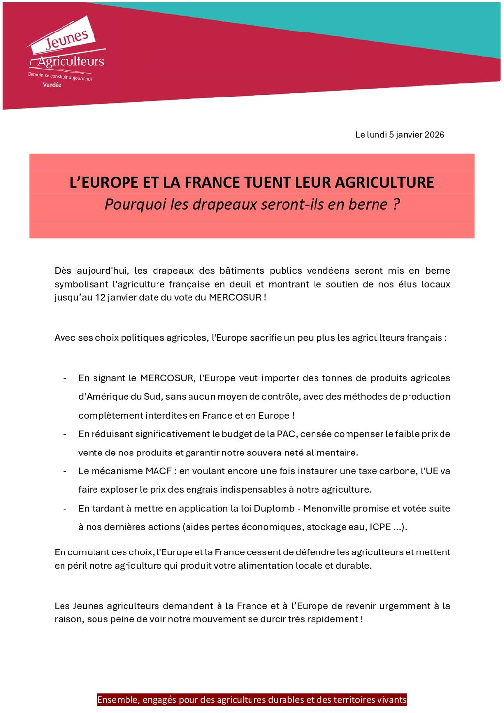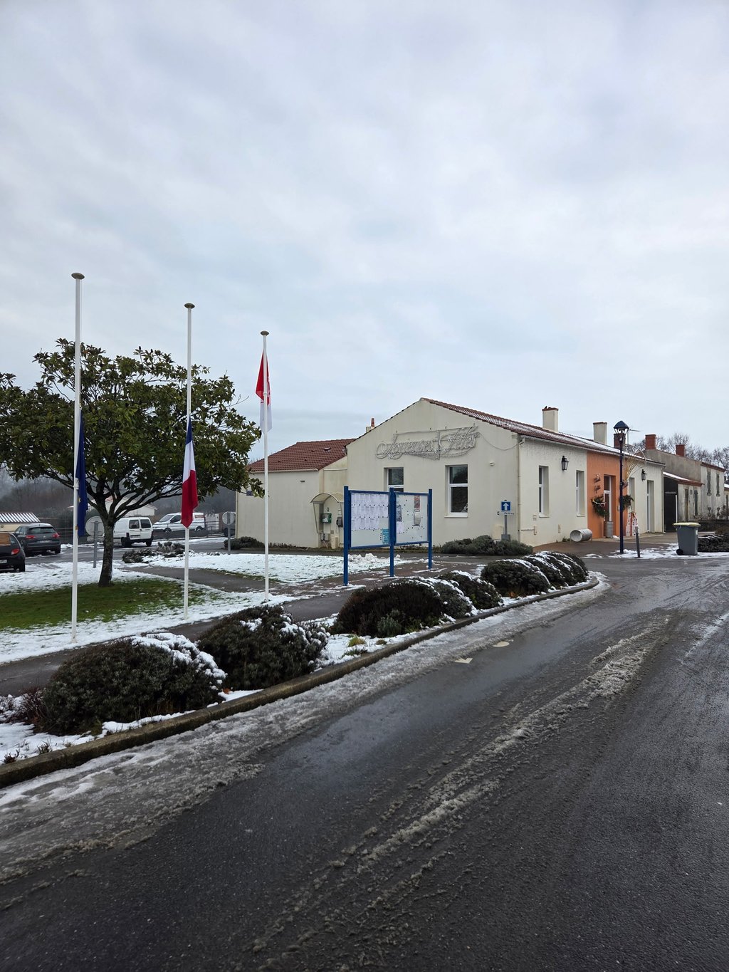 Les drapeaux devant la mairie sont en berne depuis mercredi matin suite à l'appel des jeunes agriculteurs de Vendée et en soutien aux agriculteurs de notre territoire.